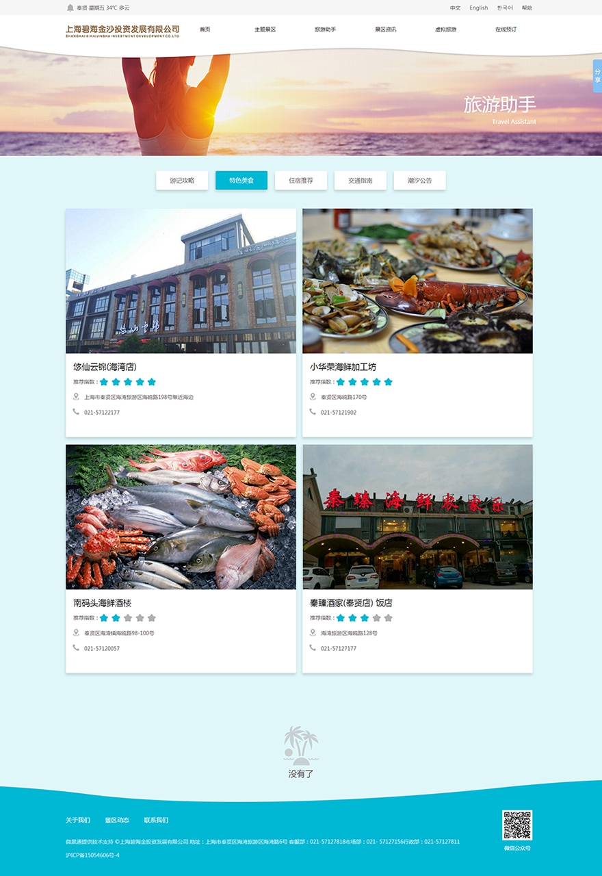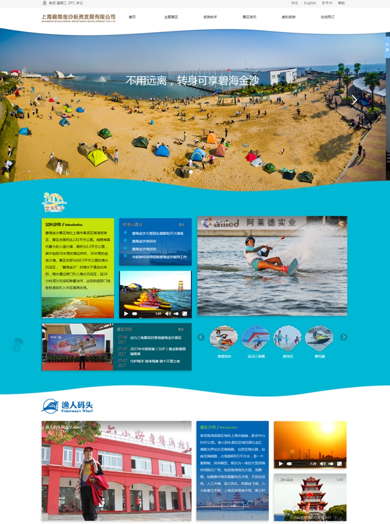 官網涵蓋“漁人碼頭”和“碧海金沙”兩個主題景區。由于景區緊靠大海,在風格的設計上,我們采用了“海浪”的元素,浪漫而略帶動感。色彩方面,BANNER以下采用“藍白黃”的搭配,除了緊扣海洋主題之外,也讓頁面更富有層次感,讓網站瀏覽者如同親臨大海。