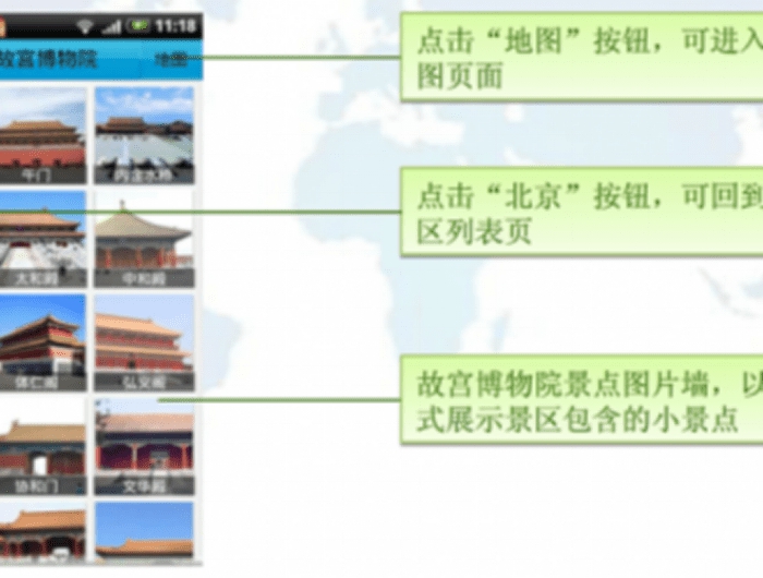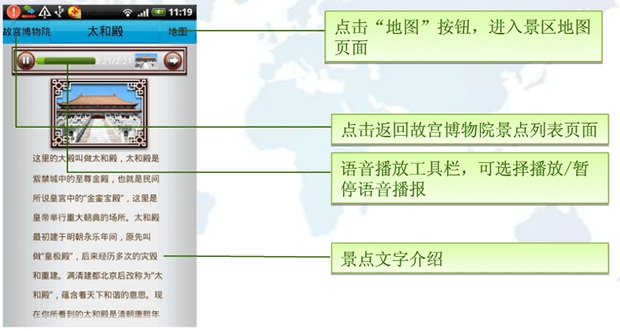 從小景點里面進入到更小的景點,如太和殿,會出現(xiàn)文字介紹頁面,以文字形式介紹景點信息