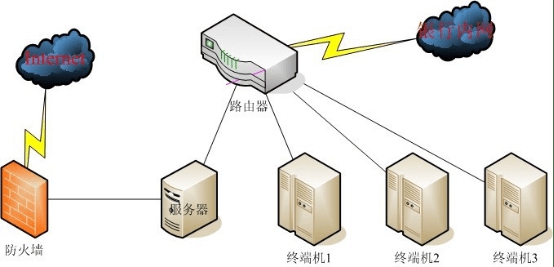 景區(qū)終端機基本網(wǎng)絡結構圖如下,通過雙網(wǎng)卡服務器同時連接Internet與銀行內網(wǎng),農行內網(wǎng)通過路由器接入,Internet則通過防火墻接入。雙網(wǎng)互不干擾,確保銀行內網(wǎng)信息安全。